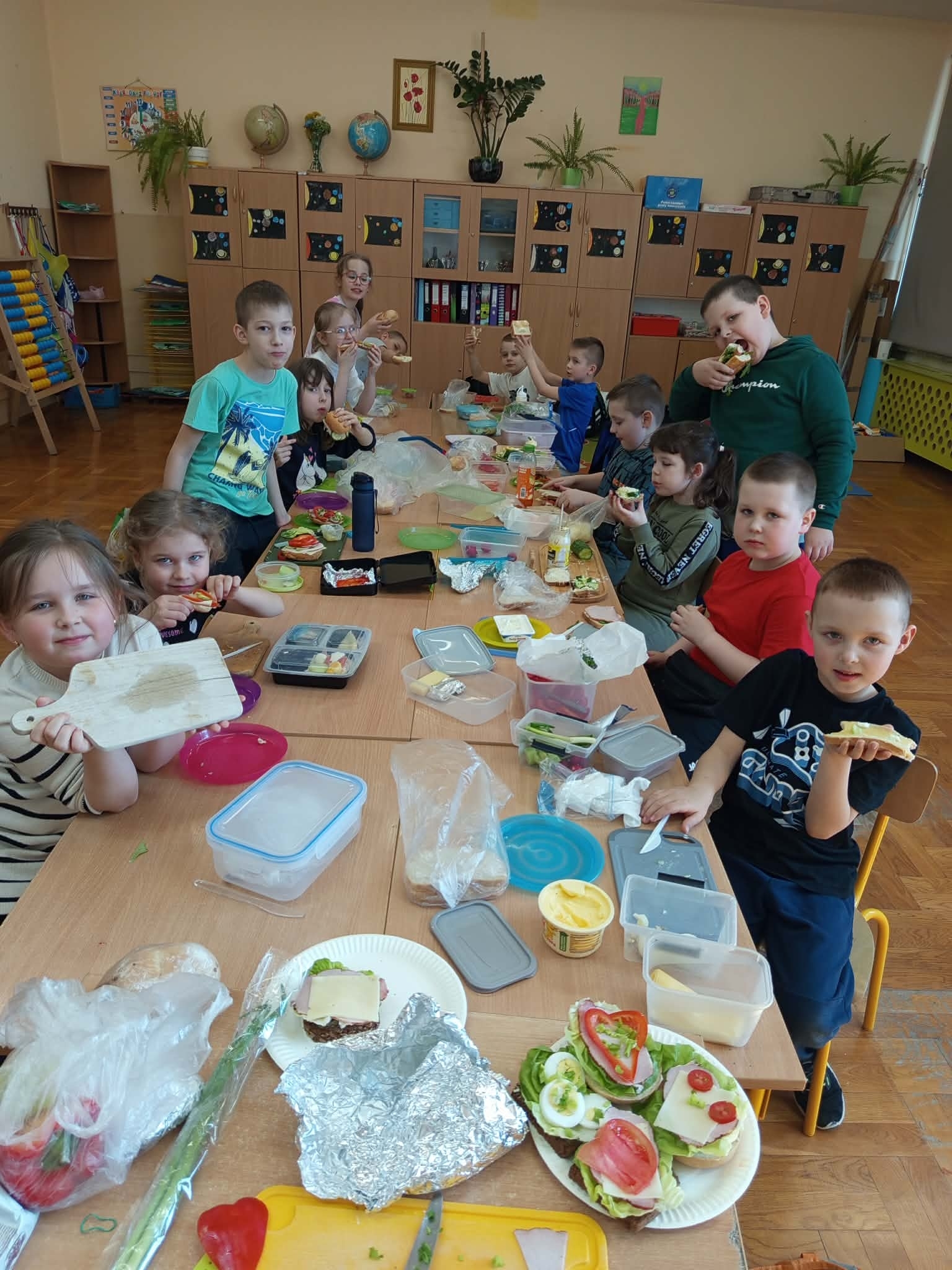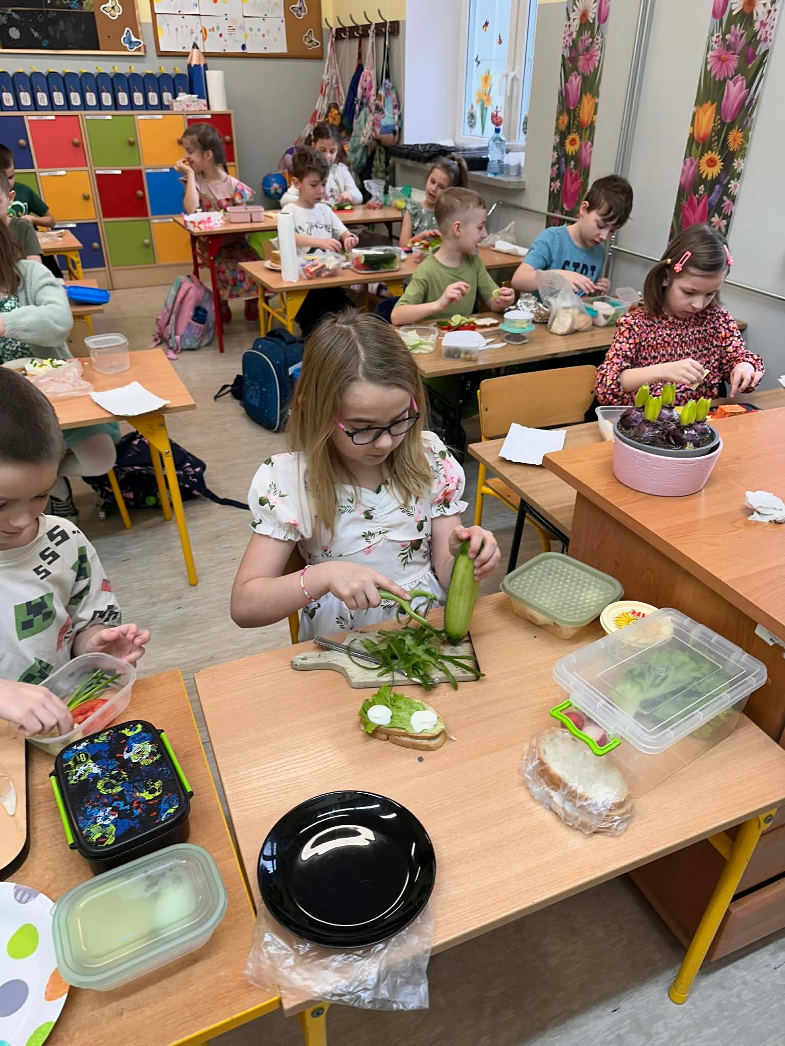 Podczas zajęć rozmawialiśmy o tym, jak ważne jest zdrowe odżywianie. Uczniowie poznali składniki, które powinny znaleźć się w codziennym posiłku, a następnie samodzielnie przygotowywali kolorowe wiosenne kanapki